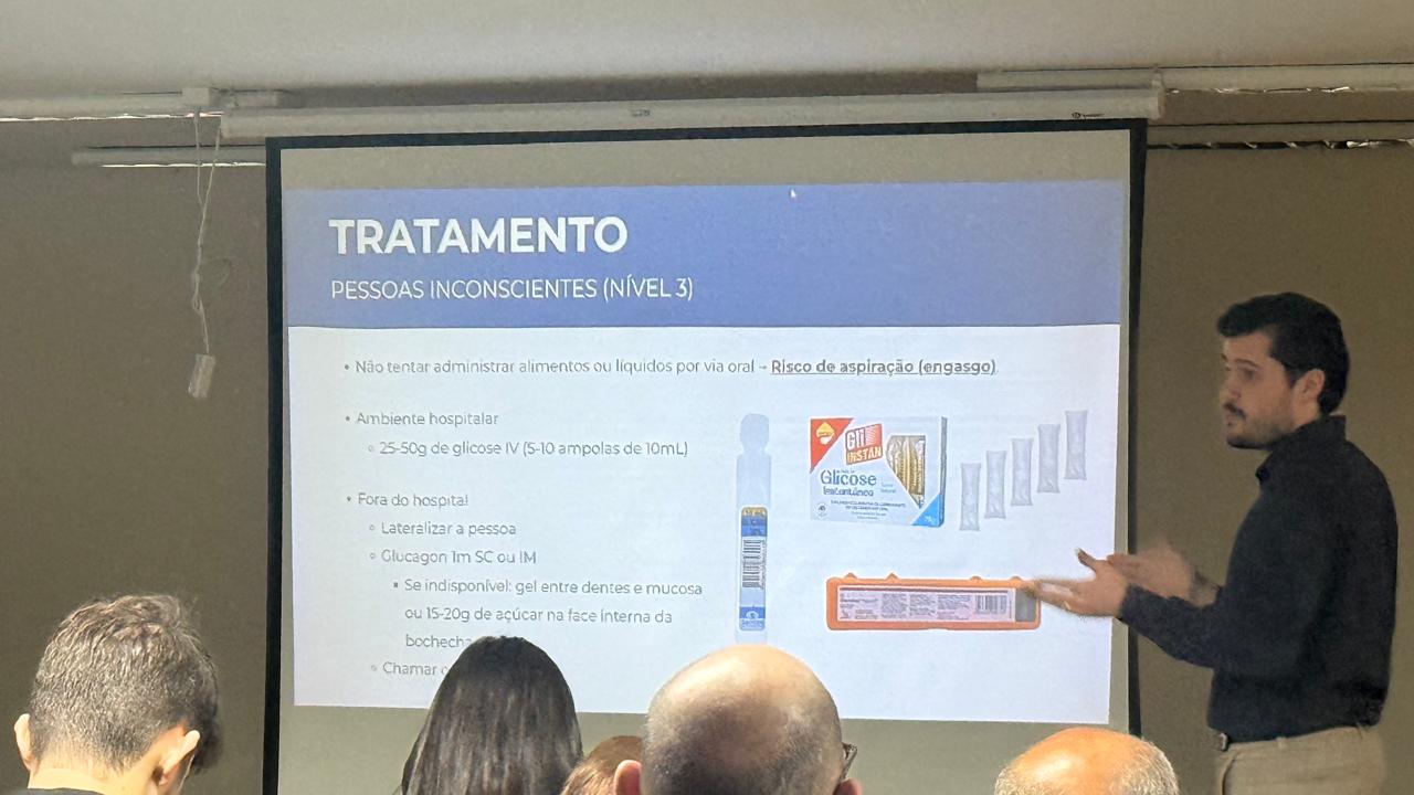 A parte prática da capacitação foi conduzida pelo Subtenente Fábio Rogério Mendes, do 4º Grupamento de Bombeiros, que realizou demonstrações técnicas de primeiros socorros em casos de hipoglicemia, fornecendo orientações claras e aplicáveis à rotina dos serviços de saúde.